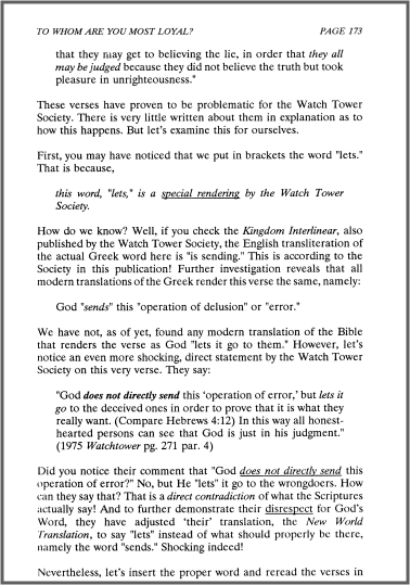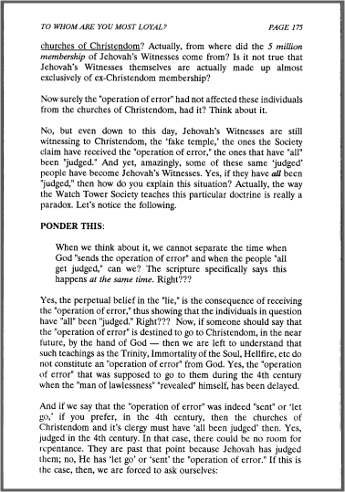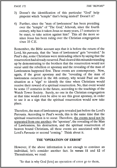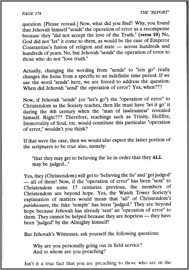 Which viewpoint do you think is more reasonable? Do you think Jehovah simply "lets" the operation of error go to individuals by the hand of Satan? Or do you think, as the bible plainly says, Jehovah directly "SENDS" the operation of error to such ungodly persons? Which viewpoint do you prefer? (Please see below scanned copies of the 1994 edition of The “REPORT” Book, Volume 1, pages 172-175 which covers the above topic in detail.)